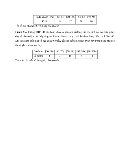 Câu 4. Cho độ dài của 60 lá dương xỉ trưởng thành được cho bằng mẫu số liệu ghép nhóm sau: