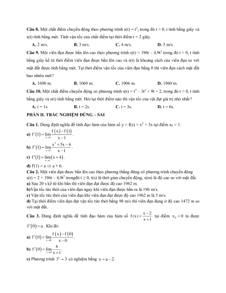 Câu 9. Một viên đạn được bắn lên cao theo phương trình s(t) = 196t – 4,9t2 trong đó t > 0, t tính