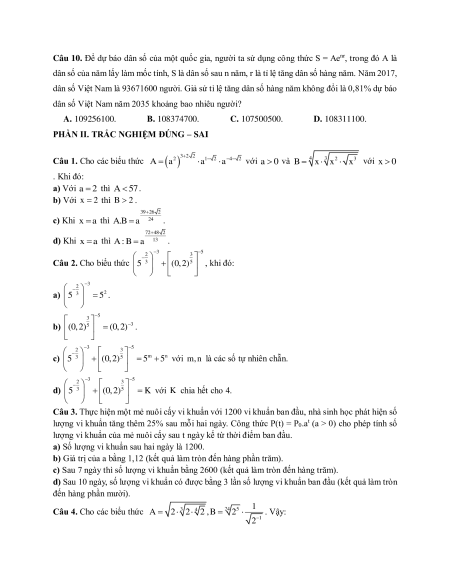 Câu 10. Để dự báo dân số của một quốc gia, người ta sử dụng công thức S = Aenr, trong đó A là