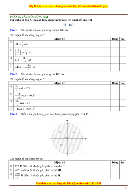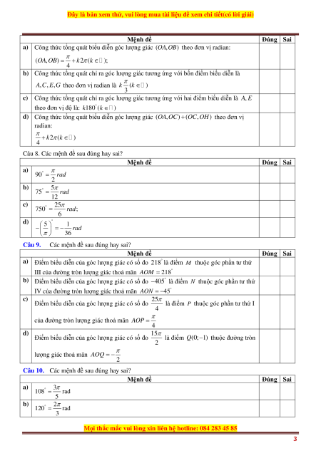 Câu 8. Các mệnh đề sau đúng hay sai? Mệnh đề Đúng Sai a) 90 = rad 2 b) 5 75 = rad 12 c) 25 750 = rad; 6 d) 5 1 − = − rad 36 Câu 9.