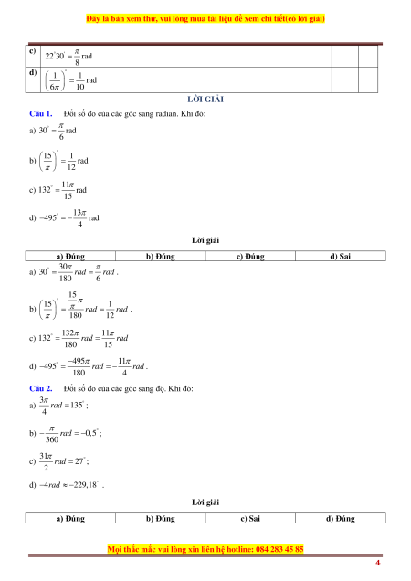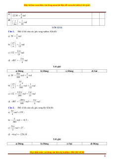 Đổi số đo của các góc sang radian. Khi đó: a) 30 = rad 6 15 1 b) = rad 12 11 c) 132 = rad 15 13 d) 495 − = − rad 4 Lời giải a) Đúng b) Đúng c) Đúng d) Sai 30 a) 30 = rad = rad . 180 6 15 15 1 b) = rad = rad . 180 12 132 11 c) 132 = rad = rad 180 15 4 − 95 11 d) 495 − = rad = − rad . 180 4 Câu 2.