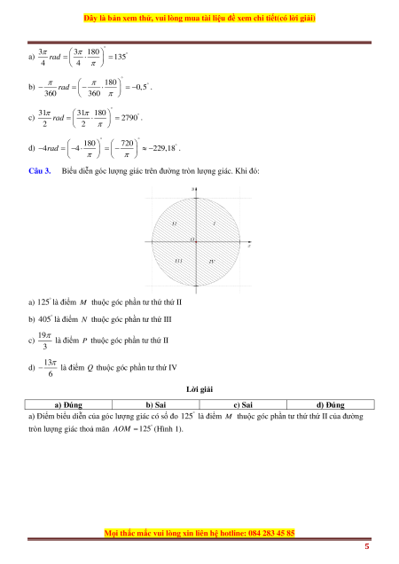 Đổi số đo của các góc sang độ. Khi đó: 3 a) rad = 135 ; 4 b) − rad = 0 − ,5 ; 360 31 c) rad = 27 ; 2 d) 4rad 229,18 − − . Lời giải a) Đúng b) Đúng c) Sai d) Đúng