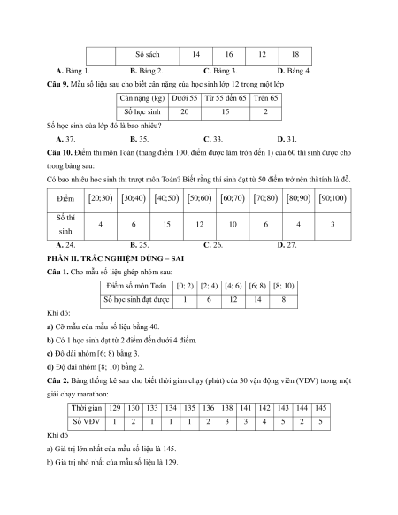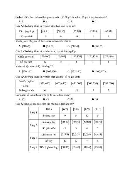 Câu 8. Bảng số liệu nào gồm các nhóm độ dài bằng 10? Điểm 6;7 7;8 8;9 9;10 Bảng 1 Số học sinh 9 14 12 5 Cân nặng (kg)