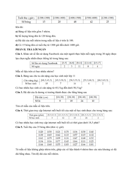 Câu 5. Thống kê tuổi thọ của các bóng đèn do một nhà máy sản xuất ta có bảng số liệu sau: