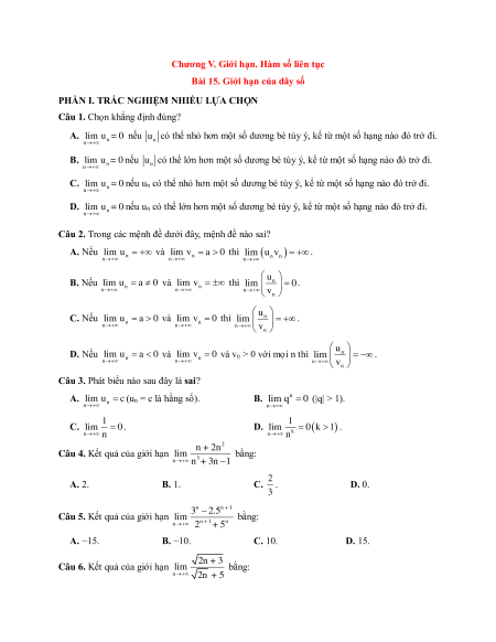 Câu 3. Phát biểu nào sau đây là sai? A. lim u c (u lim q 0 (|q| > 1). n n = c là hằng số). B. n n n 1 1 C. lim 0 . D. l m i 0k 1 . n n n k n 2 n + 2n