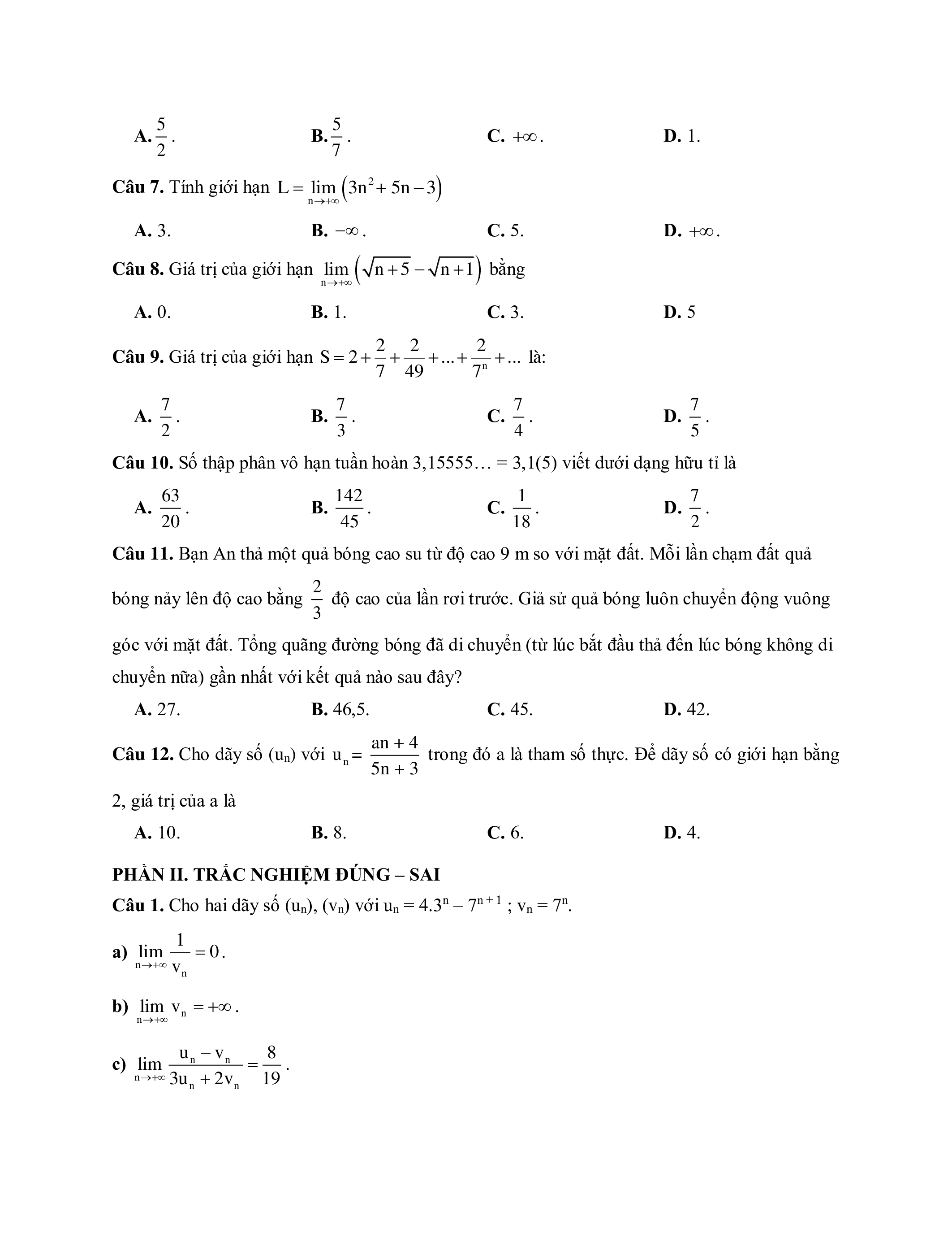 Câu 9. Giá trị của giới hạn S 2 ... ... là: n 7 49 7 A. 7 . B. 7 . C. 7 . D. 7 . 2 3 4 5