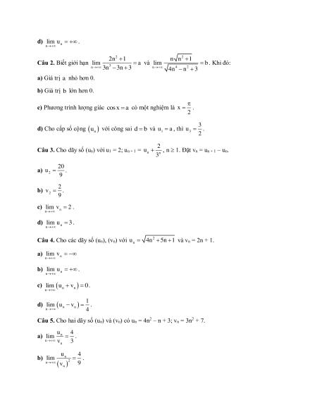 Câu 1. Cho hai dãy số (un), (vn) với un = 4.3n – 7n + 1 ; vn = 7n. a) 1 lim 0. n vn b) lim v . n n c) u v 8 n n lim . n 3u 2v 19 n n d) lim u . n n 2 2