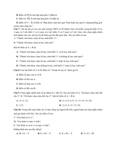 Câu 9. Chọn ngẫu nhiên một số tự nhiên từ 1 đến 20. Xét các biến cố A: “Số được chọn chia hết