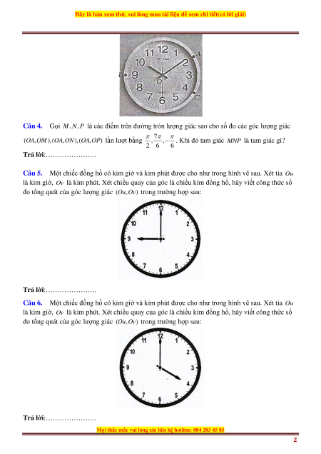 Câu 2. Từ hình vẽ đường tròn lượng giác, hãy viết công thức số đo tổng quát của góc lượng giác (O , A ON ) .