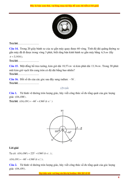Trả lời: (O , A ON ) 60 k360 = − + (k ) Lời giải Ta có: ( , OA OM ) 225 k360 = + (k ) ; (O , A ON ) 60 k360 = − + (k ) .