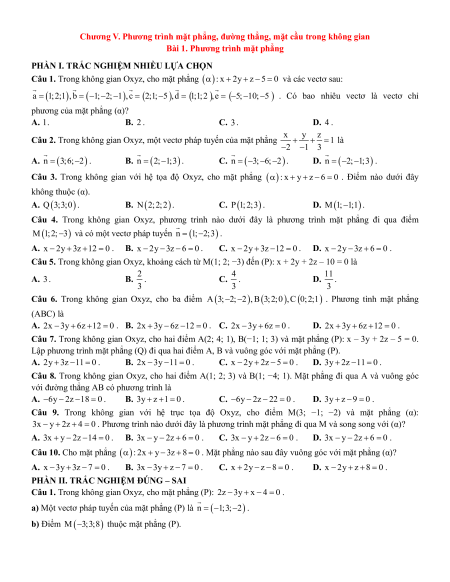Chương V. Phương trình mặt phẳng, đường thẳng, mặt cầu trong không gian