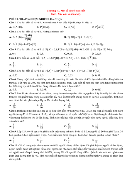 Câu 1. Cho hai biến cố A và B. Xác suất của A với điều kiện B, được kí hiệu là A. P A | B . B. P B | A . C. P AB . D. P A | B .