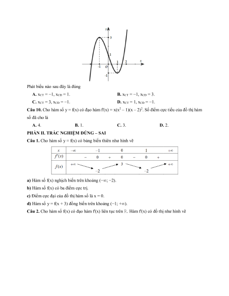Câu 10. Cho hàm số y = f(x) có đạo hàm f'(x) = x(x2 – 1)(x – 2)2. Số điểm cực tiểu của đồ thị hàm số đã cho là A. 4. B. 1. C. 3. D. 2.