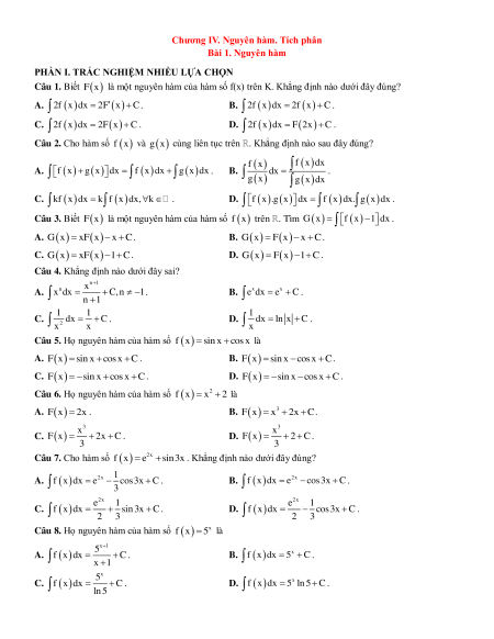 Câu 1. Biết Fx là một nguyên hàm của hàm số f(x) trên K. Khẳng định nào dưới đây đúng? A. 2f