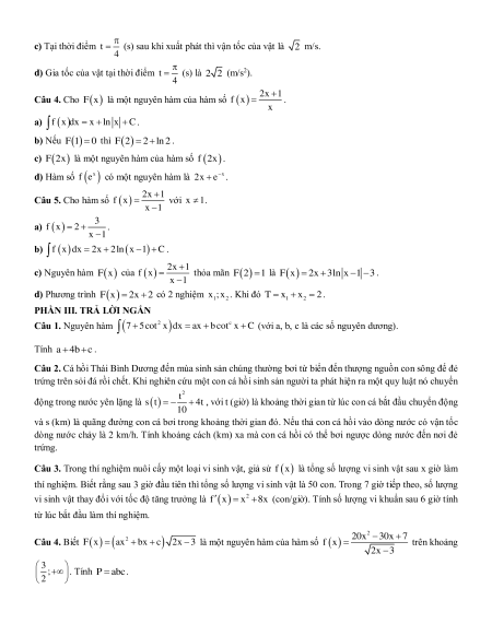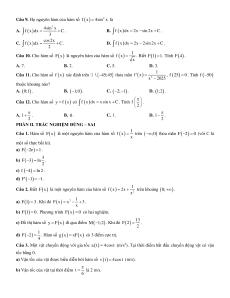 Câu 1. Hàm số Fx là một nguyên hàm của hàm số 1 f x trên ; 0 thỏa mãn F 2 0 (với C là x một số thực bất kì). a) F 2 e 1. b) 3 F 3 ln . 2 c) f 4 ln 2 . d) F 1 1 . Câu 2. Biết 1