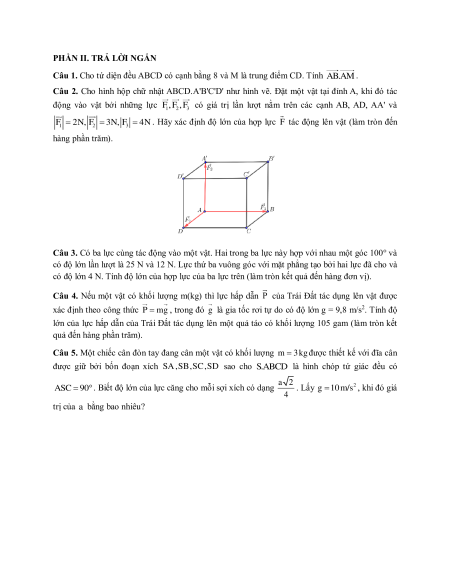Câu 2. Cho hình hộp chữ nhật ABCD.A'B'C'D' như hình vẽ. Đặt một vật tại đỉnh A, khi đó tác