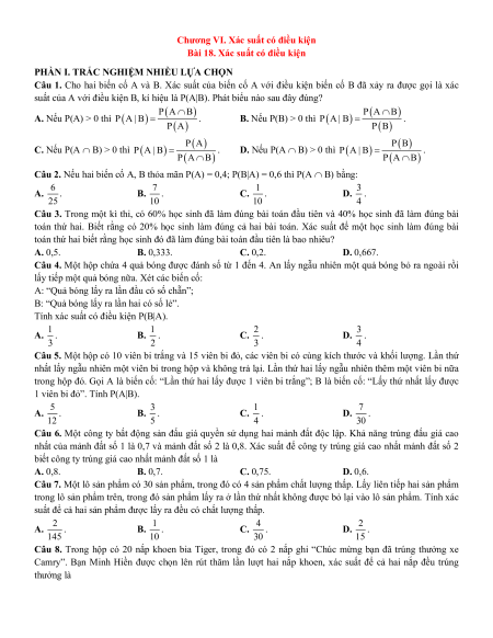 Câu 1. Cho hai biến cố A và B. Xác suất của biến cố A với điều kiện biến cố B đã xảy ra được gọi là xác