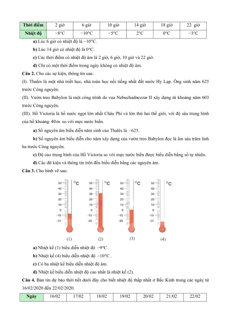 Câu 1. Bảng thống kê dưới đây cho biết nhiệt độ trong một ngày mùa đông của một vùng xứ lạnh: Thời điểm 2 giờ 6 giờ 10 giờ 14 giờ 18 giờ 22 giờ Nhiệt độ −8°C −10°C −5°C 2°C 0°C −3°C