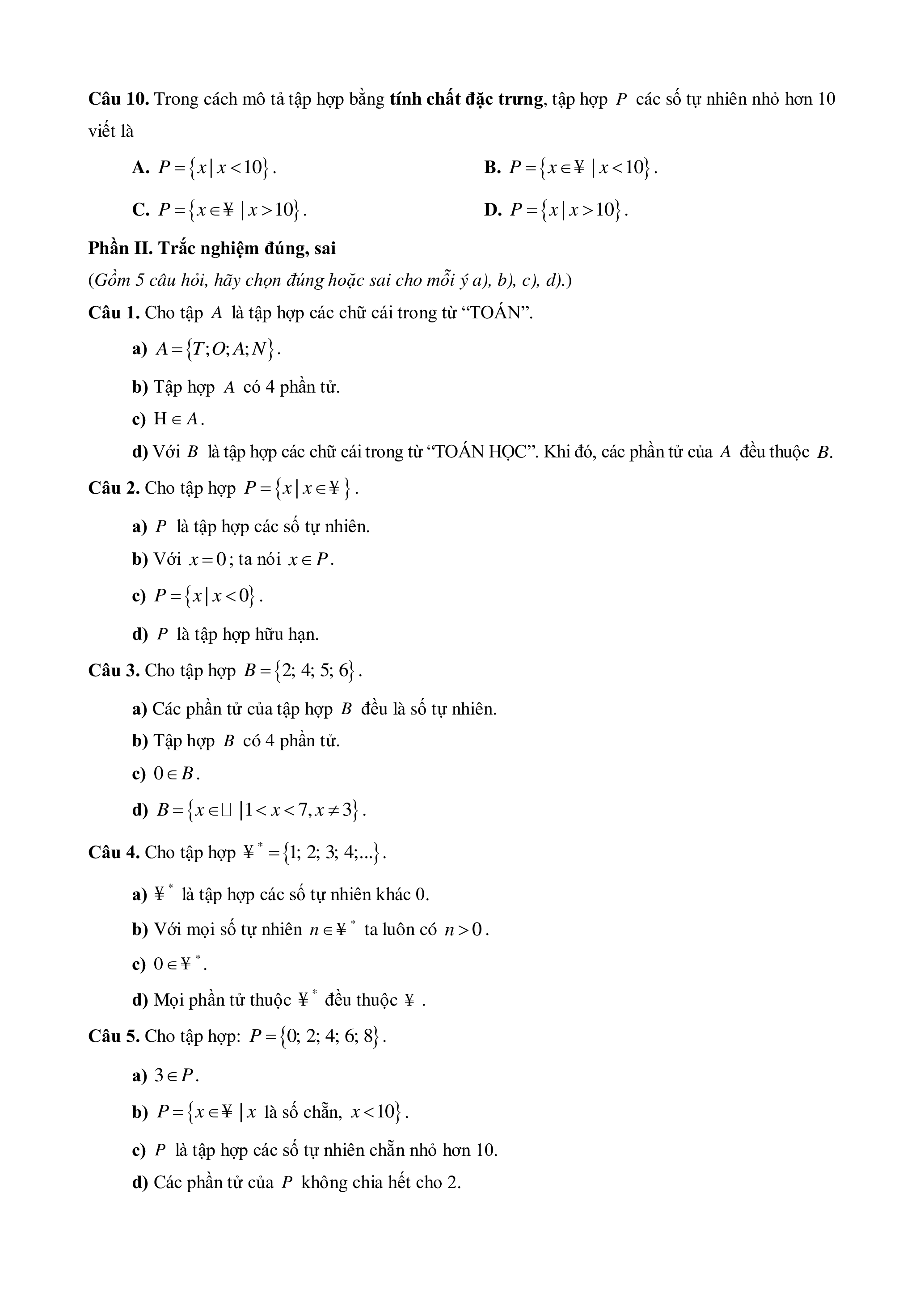 Câu 10. Trong cách mô tả tập hợp bằng tính chất đặc trưng, tập hợp P các số tự nhiên nhỏ hơn 10 viết là