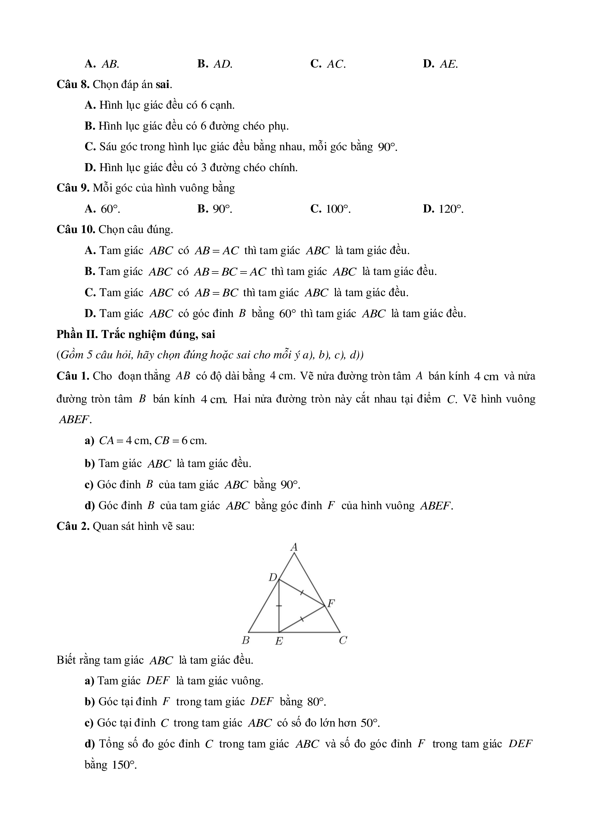 Câu 6. Mỗi góc trong tam giác đều bằng A. 30 . B. 45 . C. 60 . D. 80 .