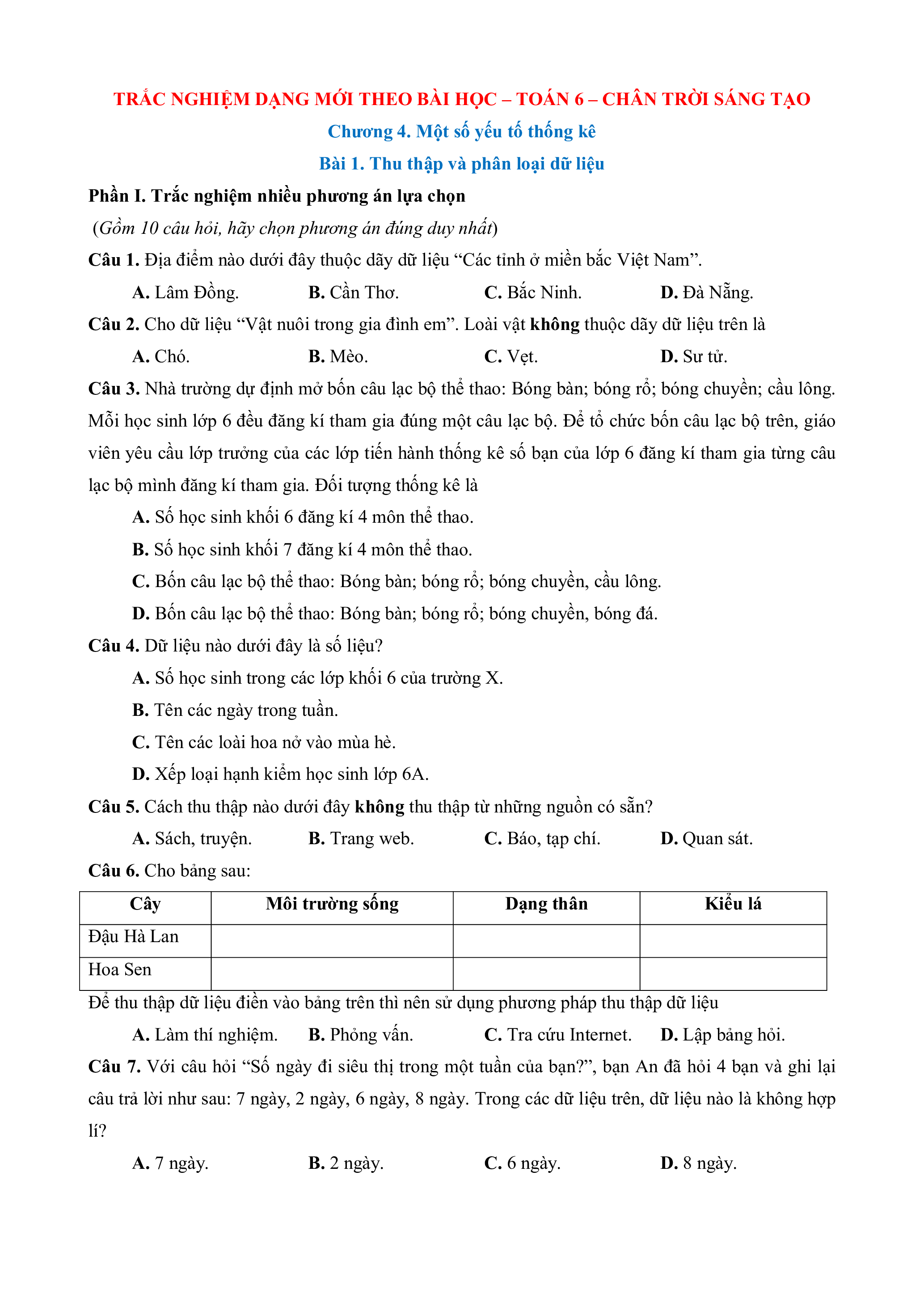 TRẮC NGHIỆM DẠNG MỚI THEO BÀI HỌC – TOÁN 6 – CHÂN TRỜI SÁNG TẠO