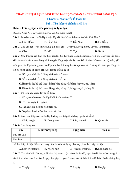 Câu 5. Cách thu thập nào dưới đây không thu thập từ những nguồn có sẵn? A. Sách, truyện. B. Trang web. C. Báo, tạp chí. D. Quan sát. Câu 6. Cho bảng sau: Cây Môi trường sống Dạng thân Kiểu lá Đậu Hà Lan Hoa Sen