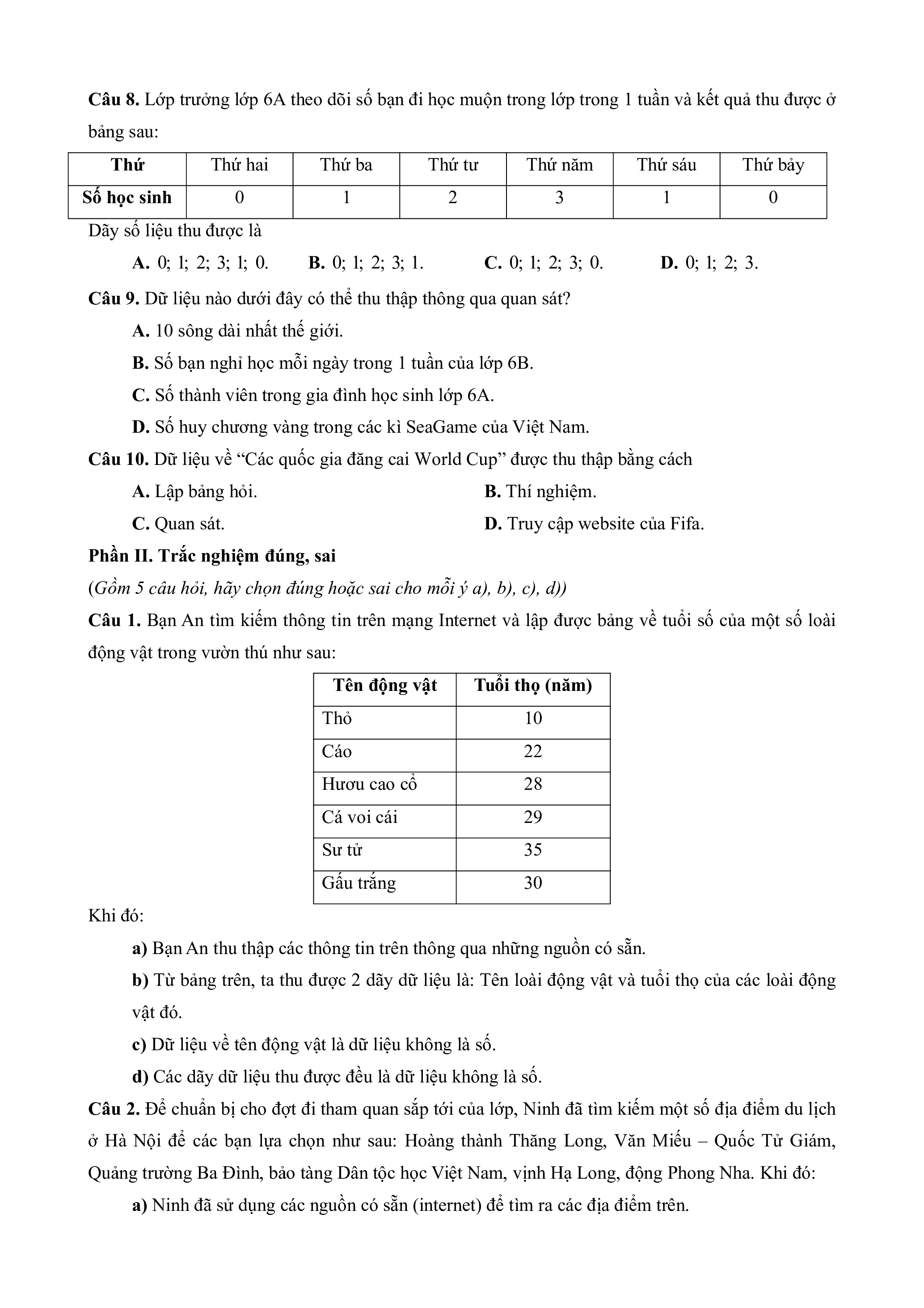 Câu 10. Dữ liệu về “Các quốc gia đăng cai World Cup” được thu thập bằng cách A. Lập bảng hỏi. B. Thí nghiệm. C. Quan sát.