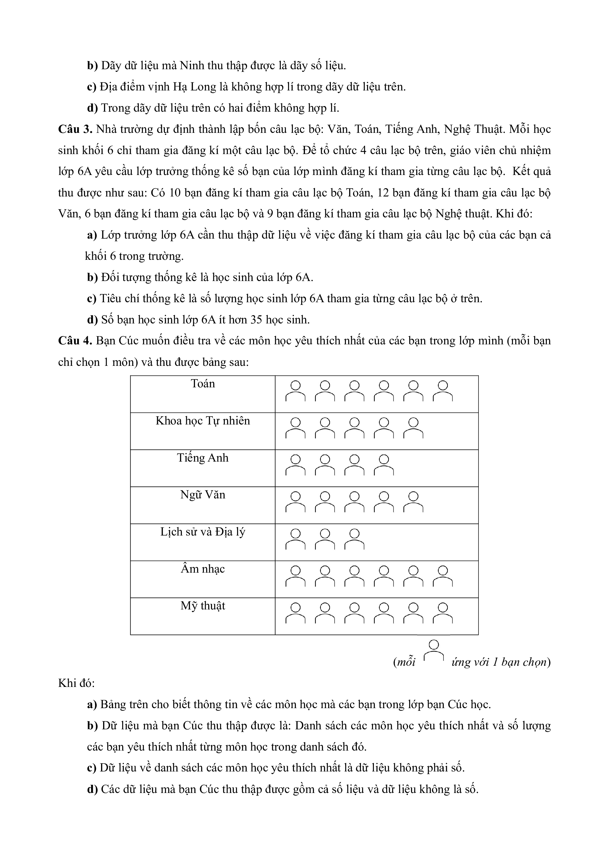 Câu 4. Bạn Cúc muốn điều tra về các môn học yêu thích nhất của các bạn trong lớp mình (mỗi bạn