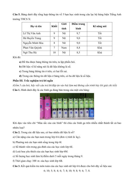 Câu 5. Bảng dưới đây tổng hợp thông tin về 5 bạn học sinh trong câu lạc bộ hùng biện Tiếng Anh trường THCS X: Giới Điểm trung Họ và tên Khối Kĩ năng nói tính bình Lê Thị Vân Anh 9 Nữ 9,7 Tốt Hà Huyền Trang 9 Nữ 9,0 Tốt Nguyễn Minh Hòa 8 Nữ 9,0 Tốt Phan Văn Quỳnh 7 Nam 8,8 Khá Ngô Thu Hà 10 Nữ 8,5 Khá Khi đó: