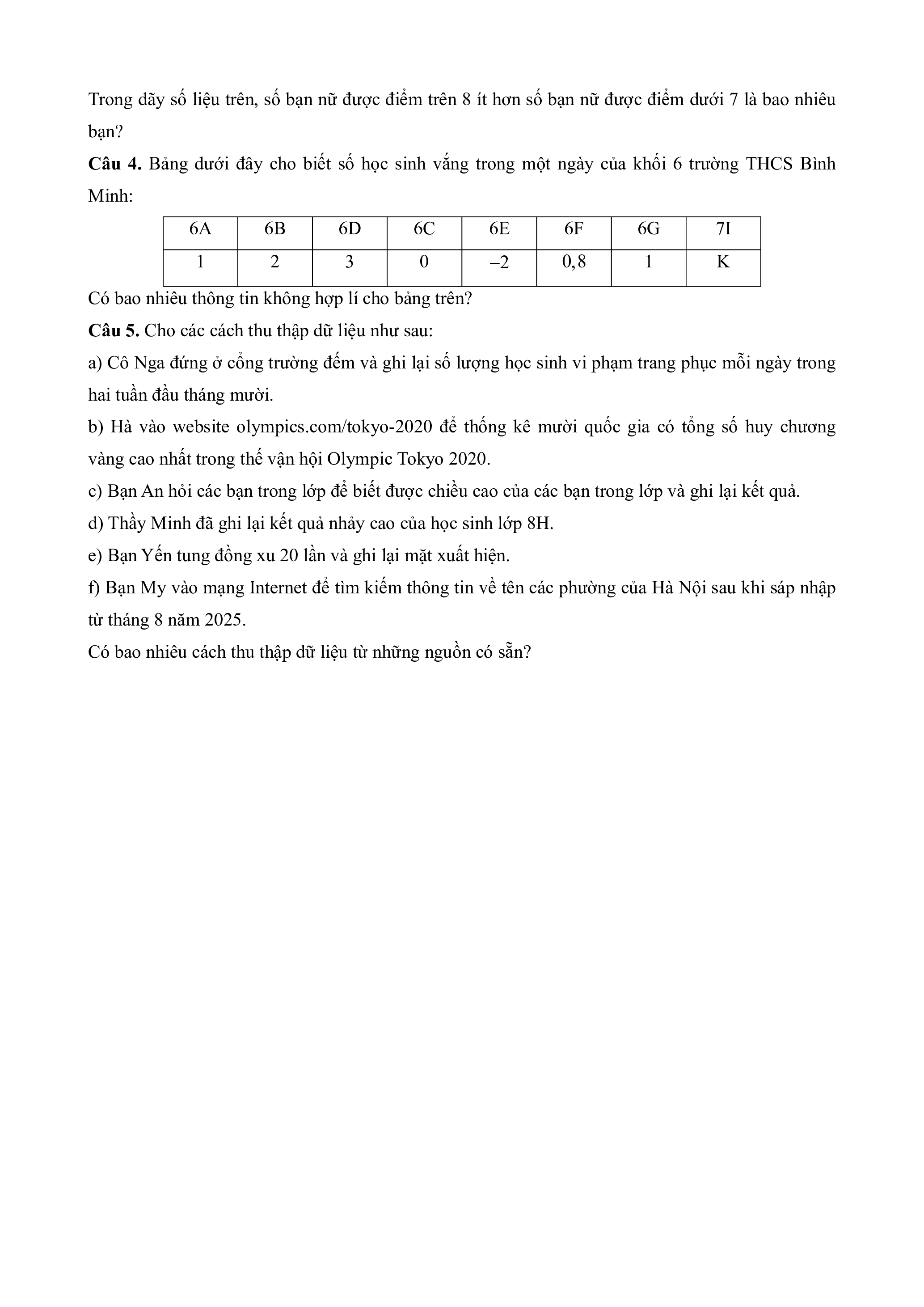Câu 3. Kết quả kiểm tra môn toán của các học sinh nữ lớp 6A được cho bởi dãy số liệu sau: