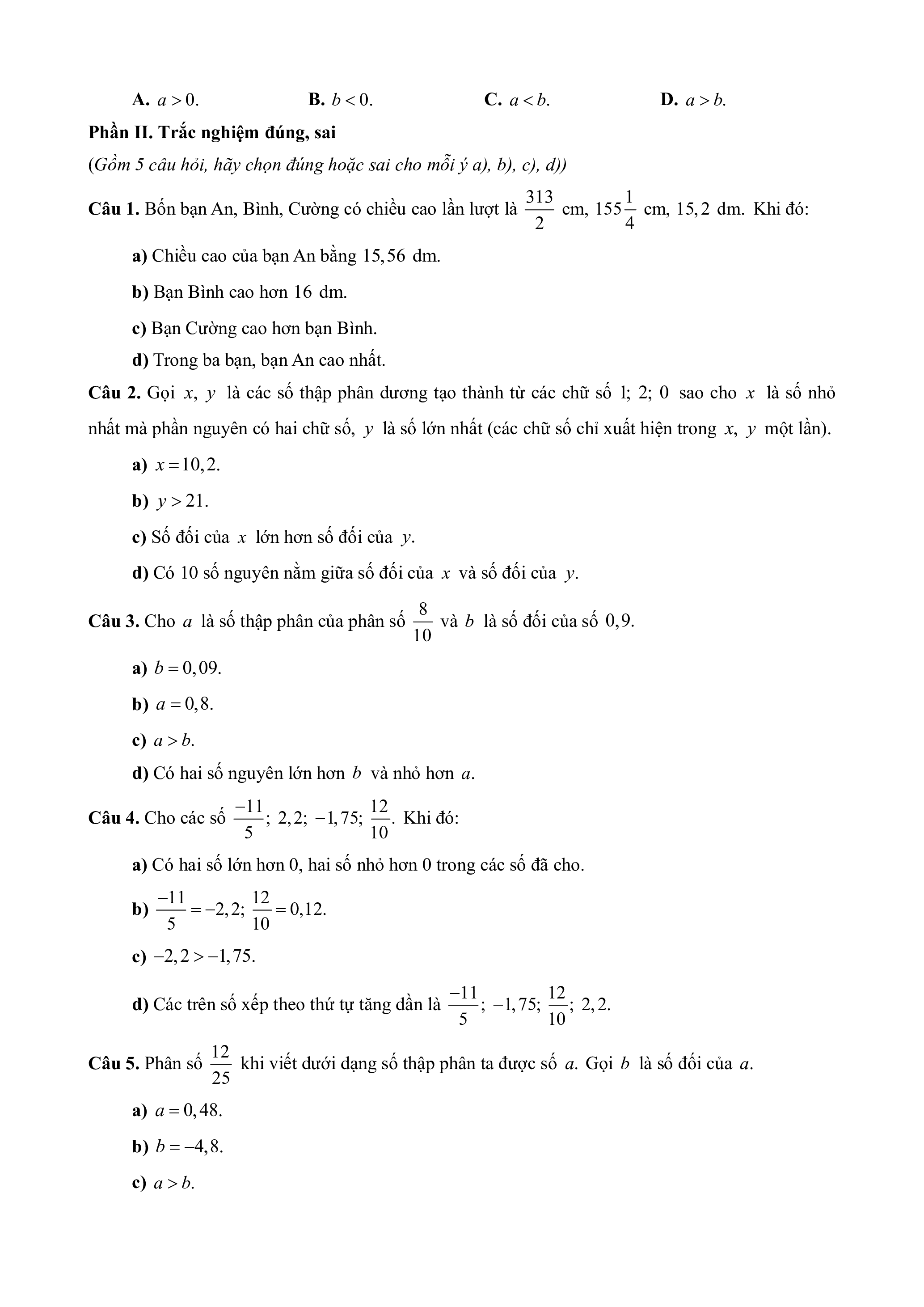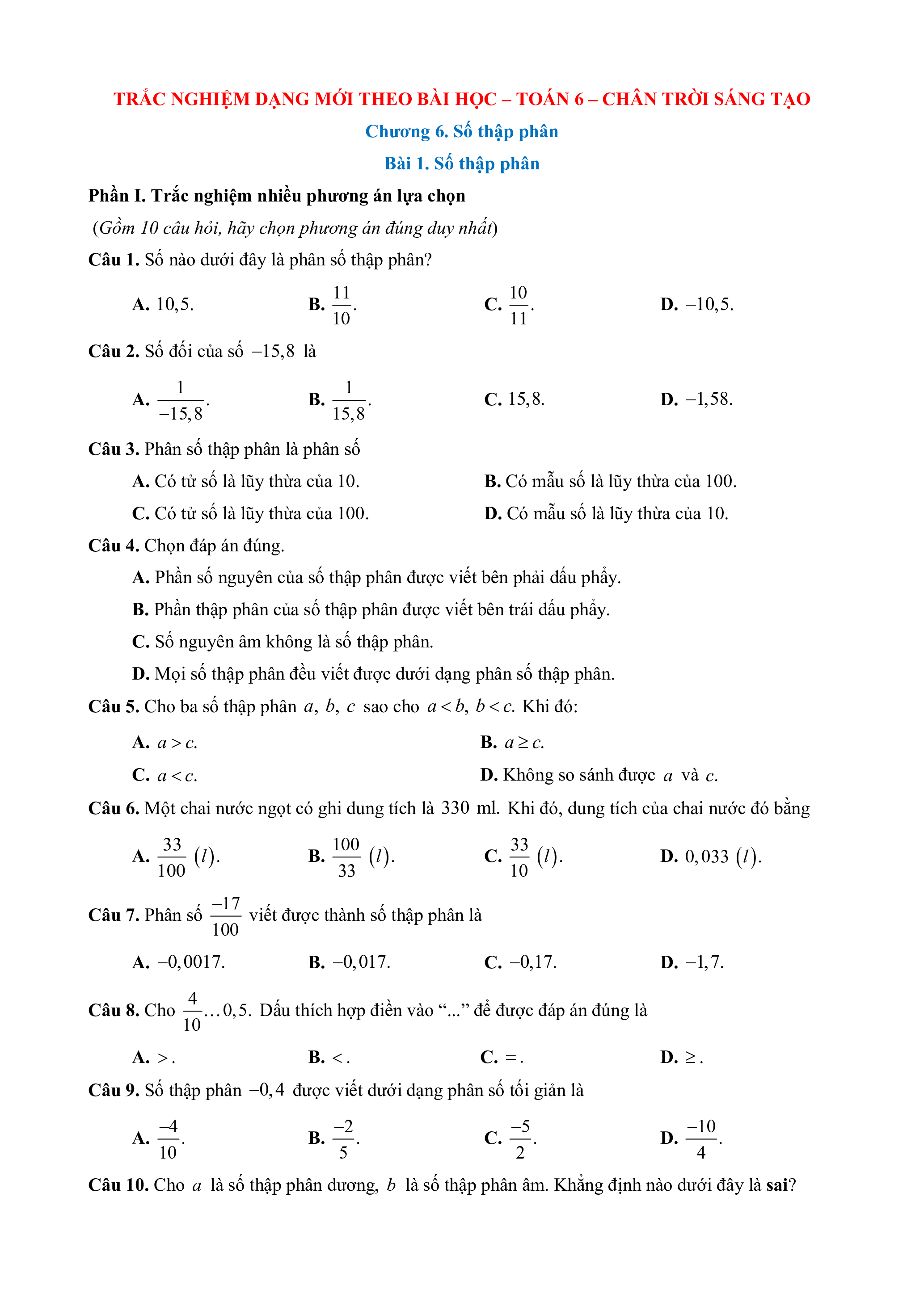 Trắc nghiệm Toán 6 Đúng-Sai, Trả lời ngắn Chương 6 Chân trời sáng tạo (form 2025)