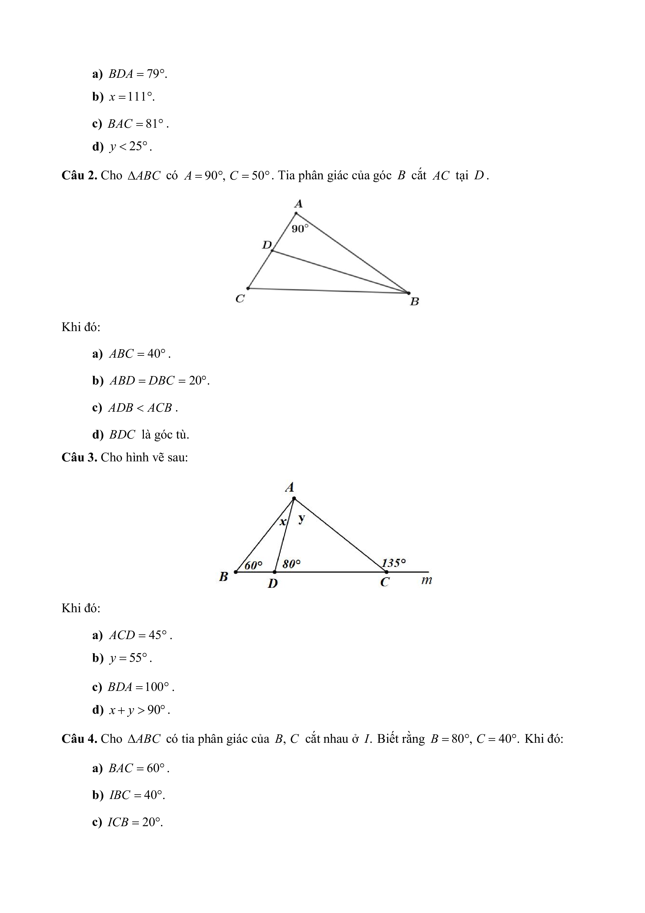 Câu 2. Cho ABC có A 90 , C 50. Tia phân giác của góc B cắt AC tại D . Khi đó: