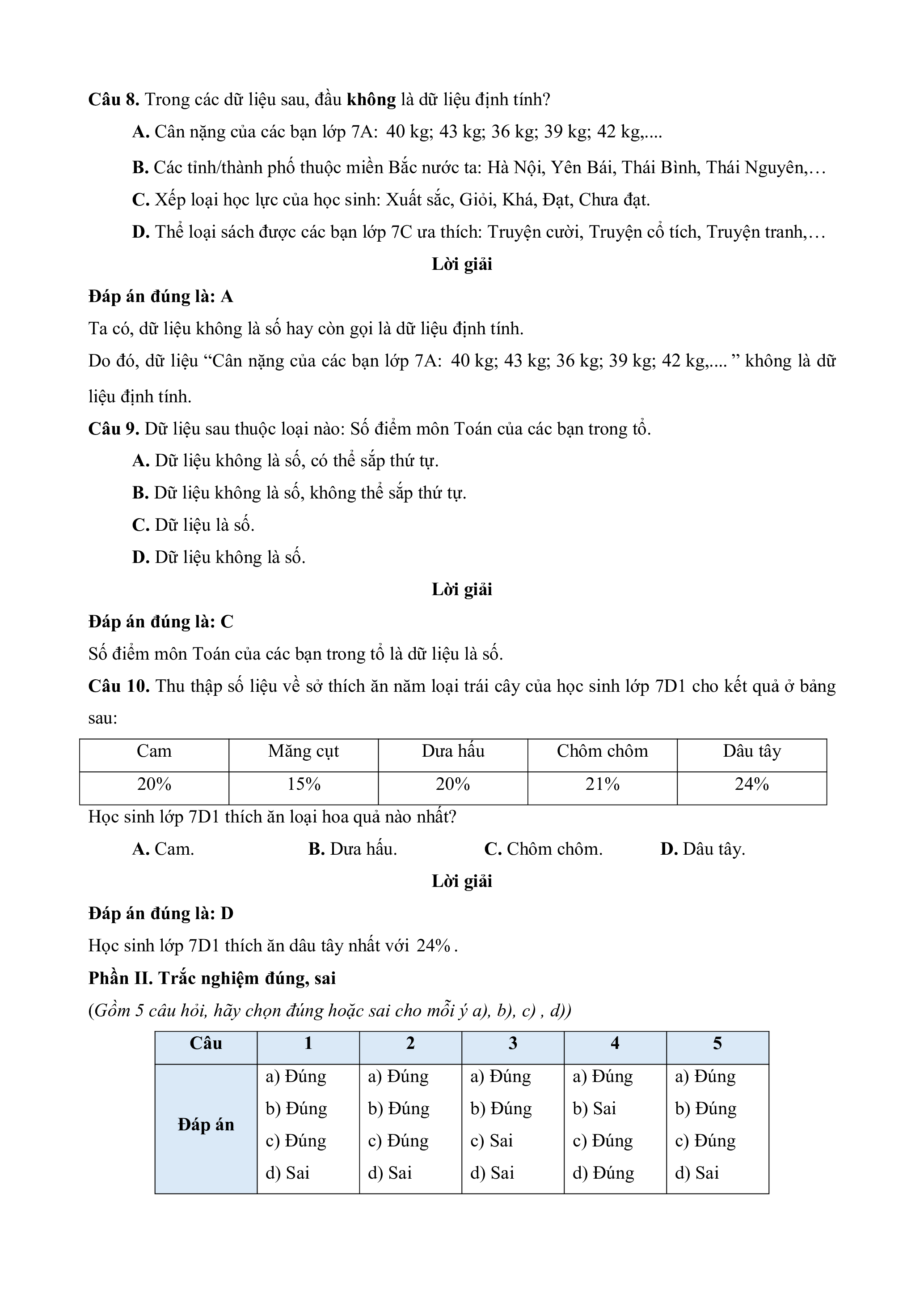 Học sinh lớp 7D1 thích ăn loại hoa quả nào nhất? A. Cam. B. Dưa hấu. C. Chôm chôm. D. Dâu tây. Lời giải Đáp án đúng là: D