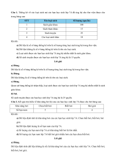 Câu 1. Thống kê về các loại sách mà các bạn học sinh lớp 7A đã ủng hộ cho thư viện được cho trong bảng sau: STT Tên loại sách Số lượng (quyển) 1 Sách giáo khoa 100 2 Sách tham khảo 15 3 Sách truyện 25 4 Các loại sách khác 10 Khi đó: