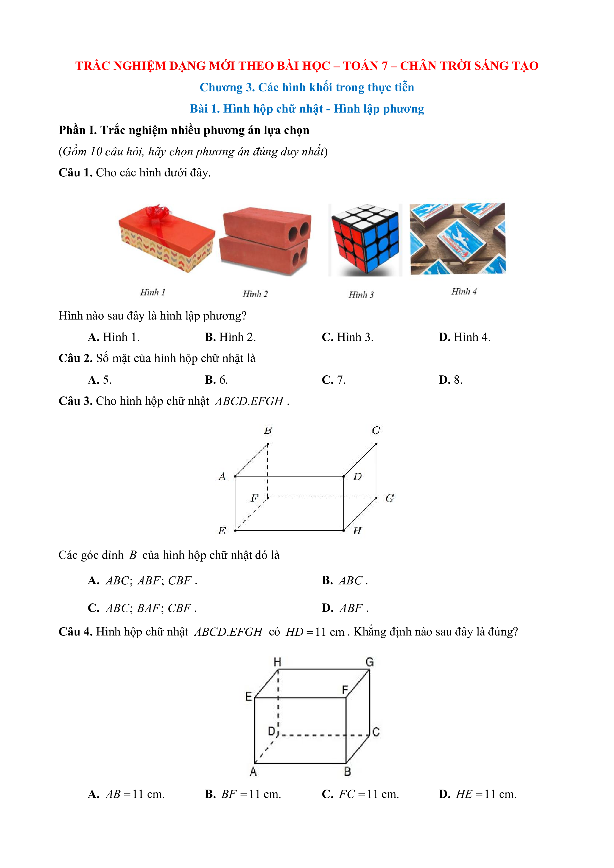 Câu 3. Cho hình hộp chữ nhật ABC . D EFGH .