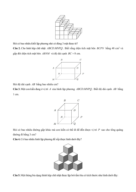 Câu 1. Sử dụng một số khối lập phương nhỏ, ta xếp thành hình khối như hình vẽ. Sau đó ta tô màu tất cả