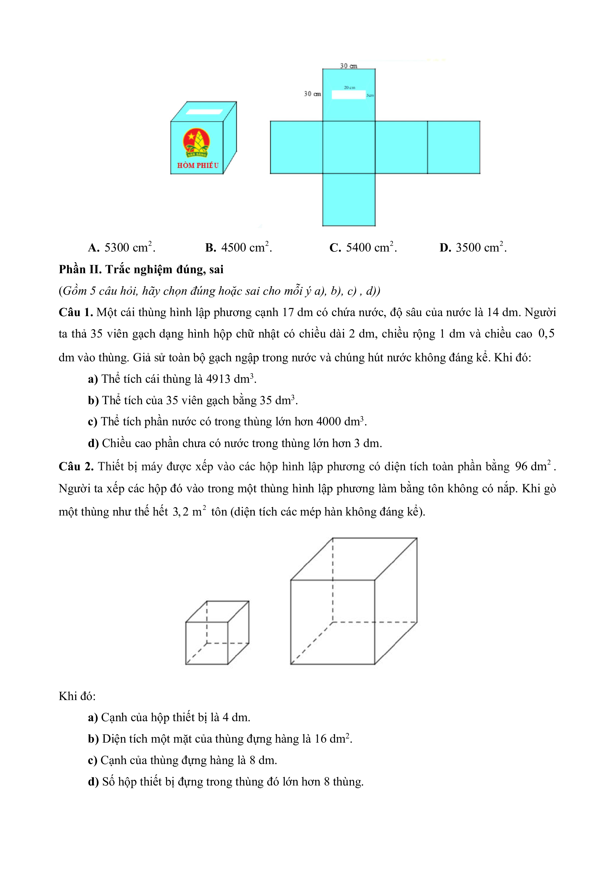 Câu 1. Một cái thùng hình lập phương cạnh 17 dm có chứa nước, độ sâu của nước là 14 dm. Người