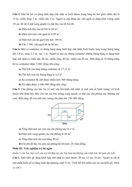 Câu 3. Một bể bơi có dạng hình hộp chữ nhật có kích thước trong lòng bể bơi gồm chiều dài là
