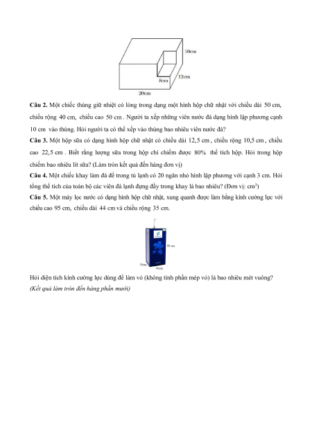 Câu 1. Một khối gỗ dạng hình hộp chữ nhật có kích thước 20 cm, 12 cm, 10 cm . Người ta cắt đi
