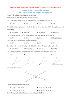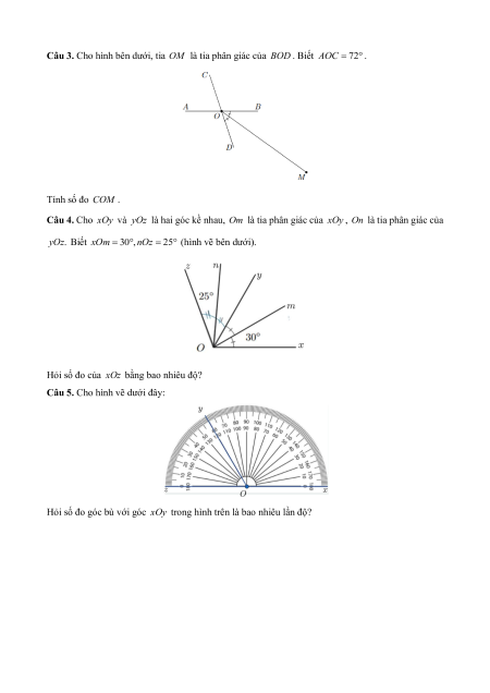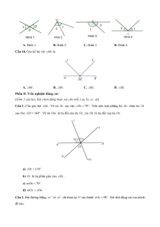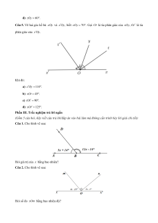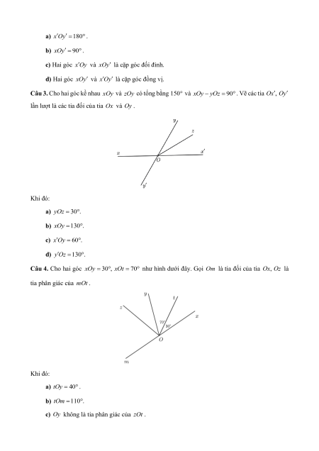 Câu 4. Hai góc kề bù có tổng số đo bằng bao nhiêu? A. 90 . B. 180 . C. 45 . D. 30 . Câu 6. Cho xOy và x Oy