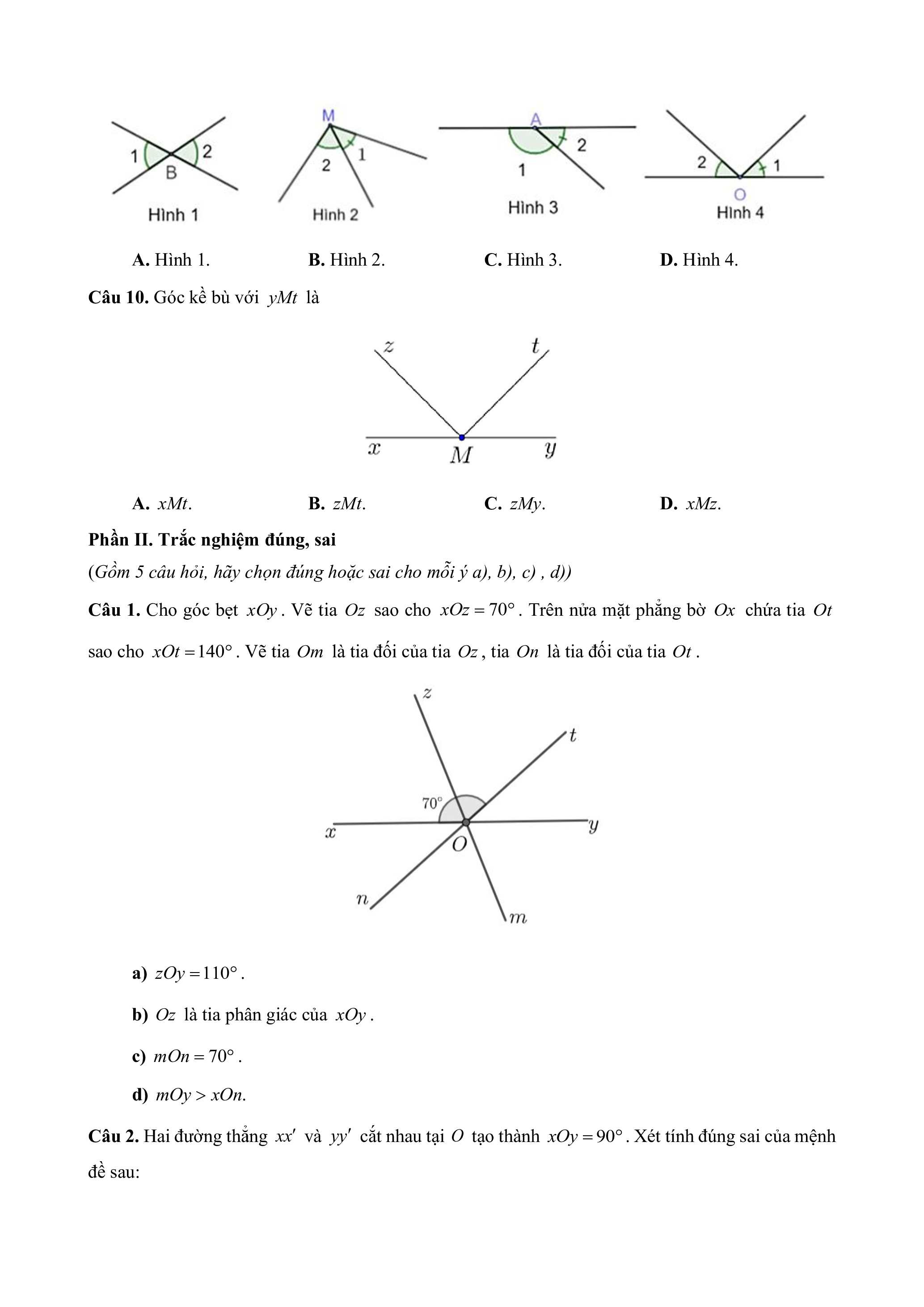 Câu 10. Góc kề bù với yMt là A. xMt. B. zMt. C. . zMy D. xMz.