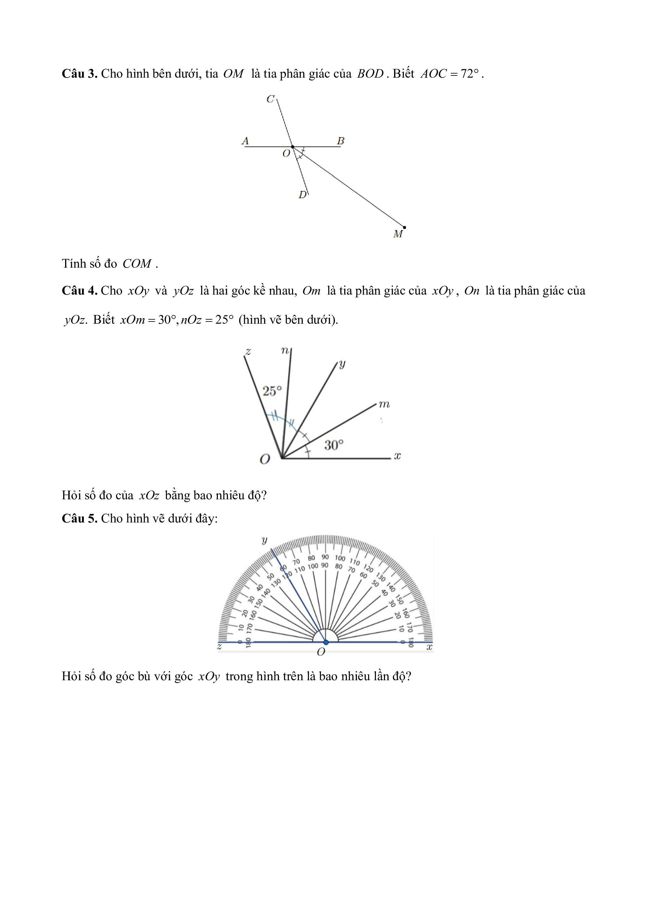 Câu 7. Trong các hình vẽ sau, hình vẽ nào thể hiện tia Oz là tia phân giác của xOy ? A. B. C. D. y y x y x z z y O z O x O z O x