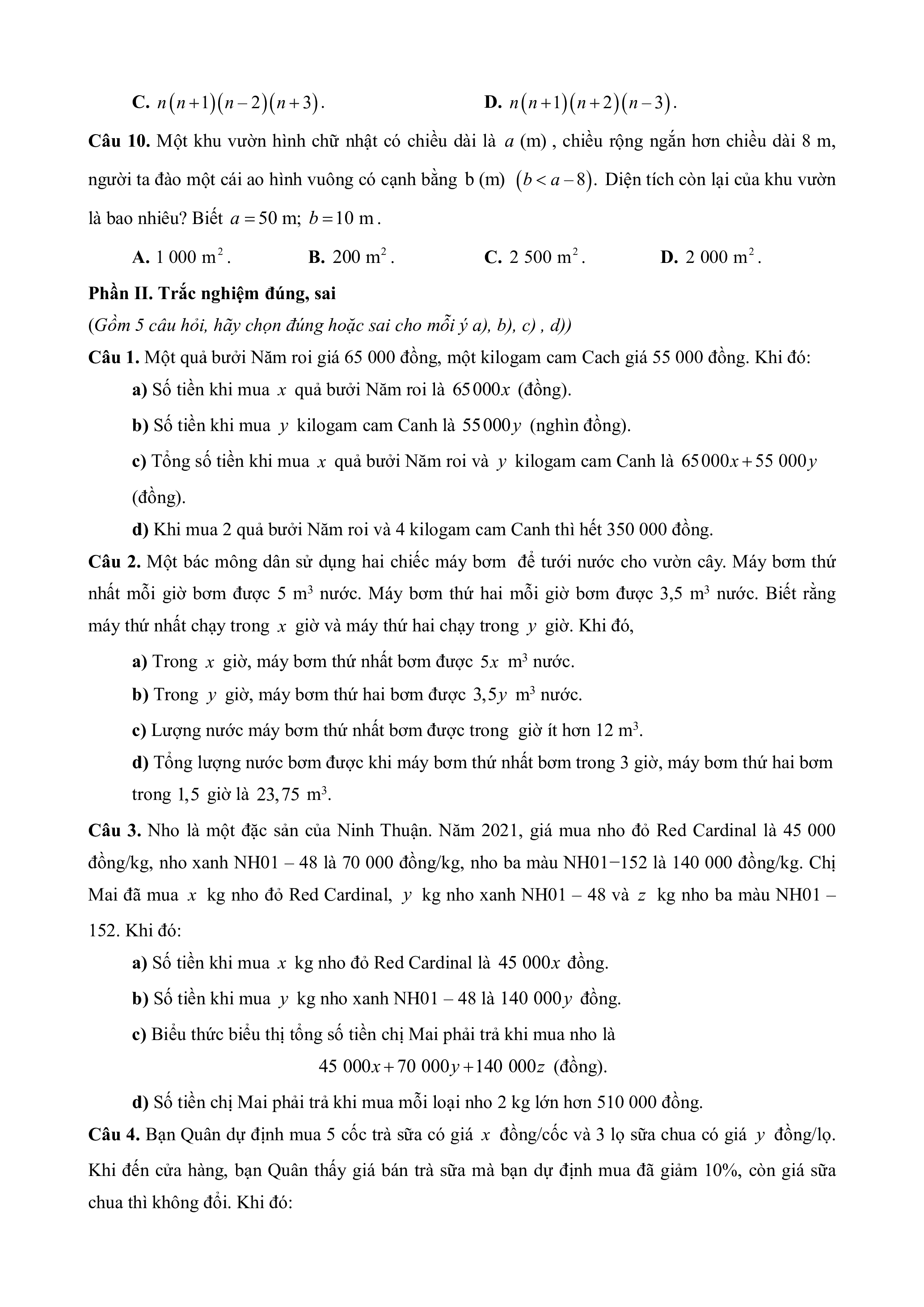 Câu 4. Bạn Quân dự định mua 5 cốc trà sữa có giá x đồng/cốc và 3 lọ sữa chua có giá y đồng/lọ.