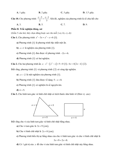 Câu 1. Phương trình nào trong các phương trình dưới đây là phương trình một ẩn? A. 2 2 x y 1. B. 2 2 x z . C. xy 1. D. 5 6 x x 1.