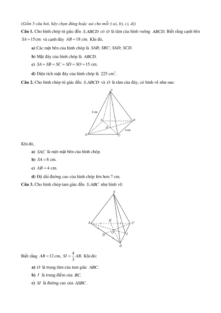 a) SAC là một mặt bên của hình chóp. b) SA 8 cm. c) AB 4 cm.