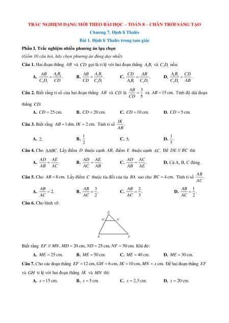 Câu 7. Cho các đoạn thẳng EF 12 cm, GH 6 cm, IK 10 cm, MN x cm. Để hai đoạn thẳng EF