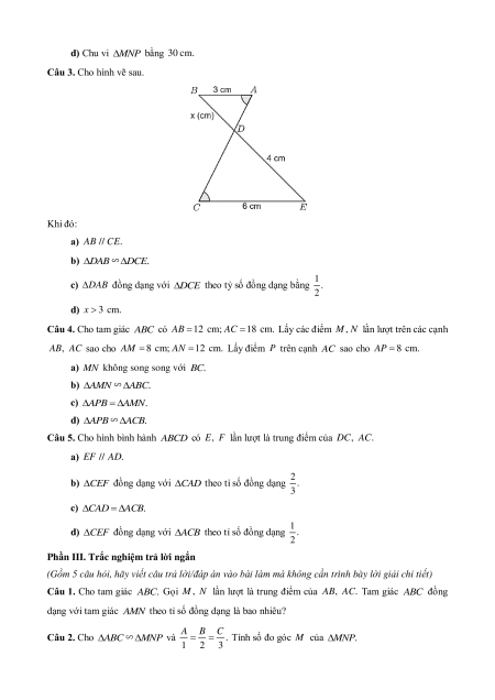 CE theo tỷ số đồng dạng bằng 1 . 2 d) x 3 cm.