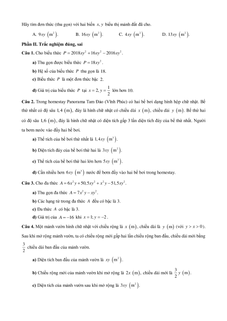 Hãy tìm đơn thức (thu gọn) với hai biến x, y biểu thị mảnh đất đã cho. A. xy 2 9 m . B. xy 2 16 m . C. xy 2 4 m . D. xy 2 13 m .
