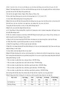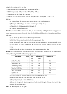 Câu 5. Bảng dưới đây là thông tin về năm học sinh trong đội chạy tiếp sức của lớp 8I : Họ và tên Cân nặng Giới Cự li chạy Kĩ thuật Số nội dung (kg) tính (m) chạy thi đấu Lê Thị Hà An 45 Nữ 50 Tốt 1 Hà Huy Hoàng 50 Nam 100 Tốt 3