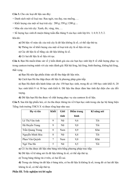 Câu 4. Bạn Hà muốn khảo sát về ý kiến đánh giá của các bạn học sinh lớp 8 về chất lượng phục vụ